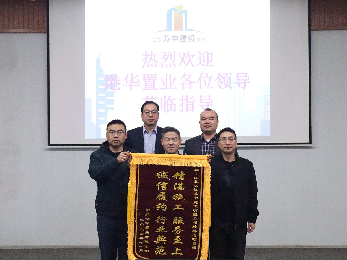 2024年11月7日上午,我公司迎來了揚州港華置業(yè)有限公司姚惠忠總經(jīng)理一行的特別拜訪,公司總經(jīng)理解志偉給予了熱情接待。在熱烈的氣氛中,姚惠忠總經(jīng)理向公司贈送了一面繡有“精湛施工、服務至上、誠信履約、行業(yè)典范”字樣的錦旗,表達了對公司翰林府項目部在項目建設中表現(xiàn)出的卓越品質(zhì)和優(yōu)良服務的肯定和感謝。