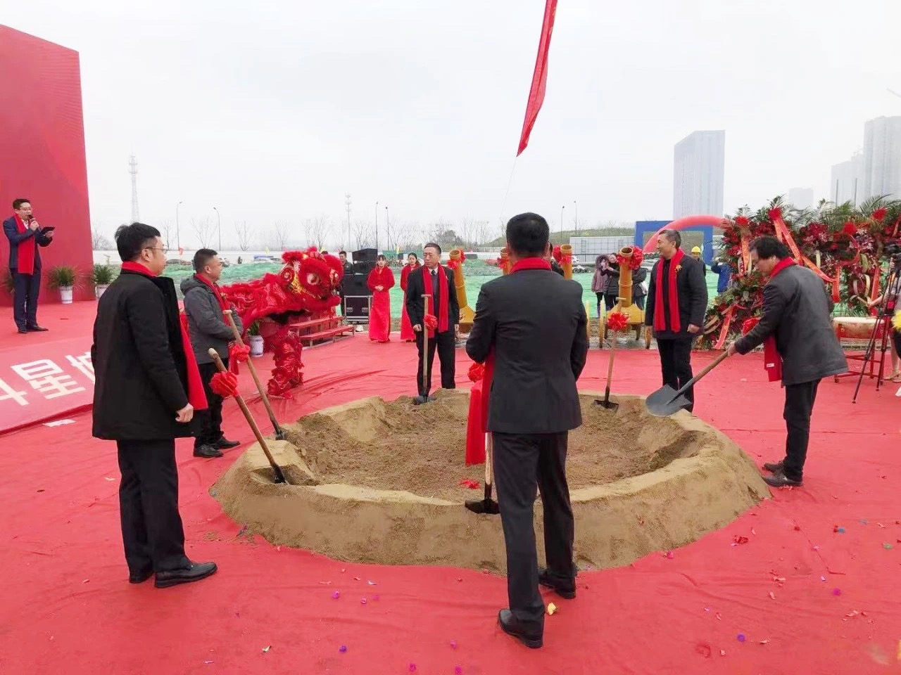 上午9點28分,北斗星城開工典禮在鑼鼓齊鳴、雄獅舞動中正式啟動。公司董事長金玉平代表項目總承包施工單位致辭,向北斗星城項目的開工建設(shè)表示熱烈祝賀,向所有關(guān)心和支持項目建設(shè)的各級領(lǐng)導(dǎo)和朋友表示最誠摯的感謝。金玉平董事長介紹了公司概況及獲得的主要榮譽;北斗星城項目,公司選派技術(shù)骨干組成項目團(tuán)隊進(jìn)駐現(xiàn)場,明確目標(biāo)、強(qiáng)化責(zé)任、靠前指揮,有信心、有決心、有能力,在項目建設(shè)方的統(tǒng)籌指揮領(lǐng)導(dǎo)、各級主管部門的支持和監(jiān)督下,快速、有序、優(yōu)質(zhì)、高效完成項目建設(shè)任務(wù),確保實現(xiàn)工程“創(chuàng)優(yōu)創(chuàng)建”各項目標(biāo),公司明確要求將北斗星城項目打造成儀征住宅工程標(biāo)桿性項目,以回報社會各界對公司一直以來的關(guān)心和支持。